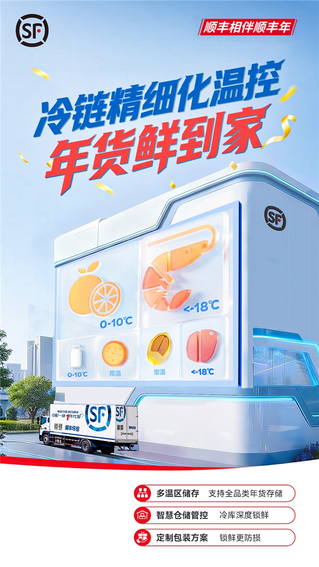 原产地的新鲜只是起点,要将这份鲜活完好送达,专业运输是至关重要的“保鲜生命线”。在仓储和长途运输过程中,生鲜极易因温度失控而腐坏、损毁,导致产品价值下降、客户体验差。顺丰构建了一套科学控温、全程可视、按需定制的多温层仓储网络,打造常温、冷藏、冷冻、恒温恒湿等五大温区,智慧温控跨度高达90℃,精准解决生鲜年货在仓储与运输过程中易腐、易损的痛点,实现全程温控可视与防护,确保生鲜“鲜度不降、品质不损”地送达。