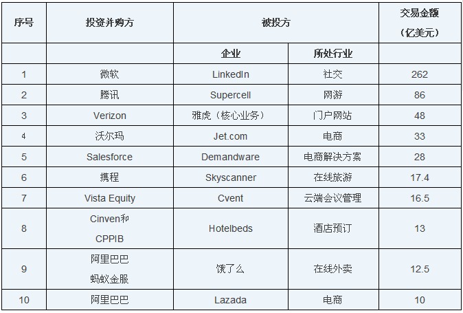 标的数十亿美元级的投资并购在2016年有多起,涉及雅虎、沃尔玛、Salesforce等公司。如下表所示。