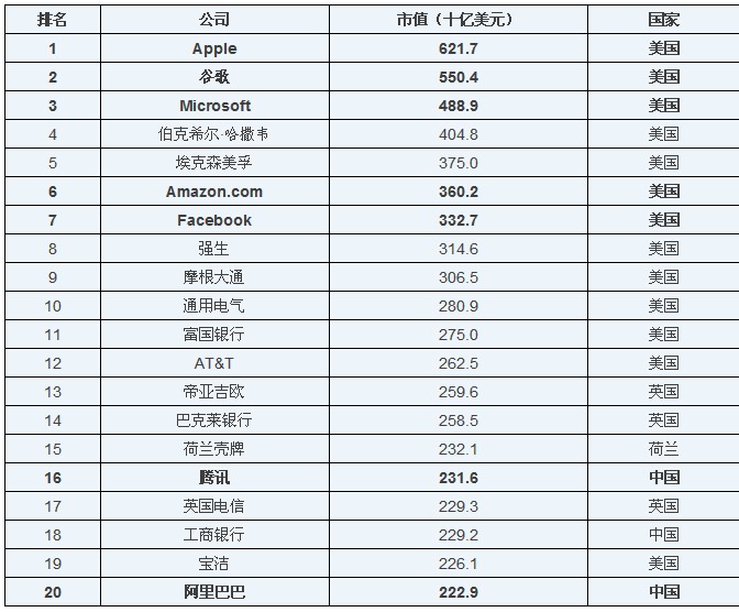 按市值,互联网公司的表现更为突出。全球市值最高的十家公司中,有苹果、谷歌、微软、亚马逊和Facebook五家互联网公司,并且互联网公司囊括了前三位;前20名中有7家互联网公司,另外两家分别是腾讯和阿里巴巴。如下表所示。