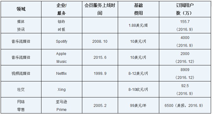作为一种前向收费模式,会员订阅付费已成为互联网的主流,在媒体资讯、流媒体、社交、网络零售等领域有着广泛应用(如下表所示)。大名鼎鼎的Netflix、亚马逊Prime、Spotify就是其中的佼佼者。