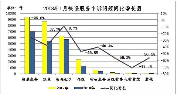 2018年1月,消费者关于快递服务的有效申诉20067件,环比下降31.4%,同比下降28.2%。消费者对快递服务申诉的主要问题的环比、同比均呈下降趋势。申诉比较集中的问题是投递服务、丢失短少和延误,占比分别为35.1%、28.5%和27.0%。