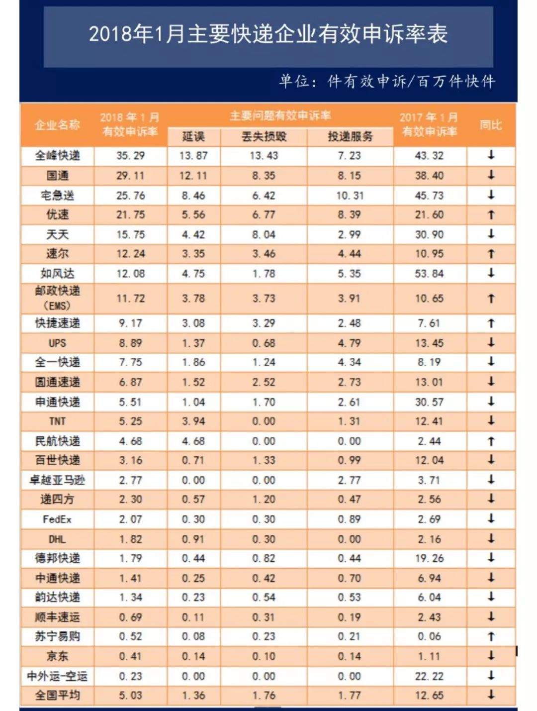 2018年1月,消费者对43家快递企业进行了有效申诉,全国快递服务有效申诉率为百万分之5.03,环比减少1.93,同比减少7.62,高于全国平均有效申诉率的快递企业有14家。全国快递服务快件投递服务的有效申诉率为百万分之1.77,同比减少2.48;快件丢失损毁的有效申诉率为百万分之1.76,同比减少2.17;快件延误的有效申诉率为百万分之1.36,同比减少2.57。