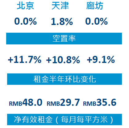吴涛表示,北京及廊坊物流市场均维持满租,天津剩余可租赁面积被迅速吸纳,空置率半年环比下降3.3个半分点至1.8%。受新增供应及剩余可租赁面积有限的影响,区域内租金创历史最高涨幅。