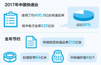 《中国快递领域绿色包装发展现状及趋势报告(2018)》日前正式对外发布,报告显示,截至2017年年底,全年节约传统纸质快递运单210亿张、节约封装胶带64亿米、节约中转编织袋4亿个。