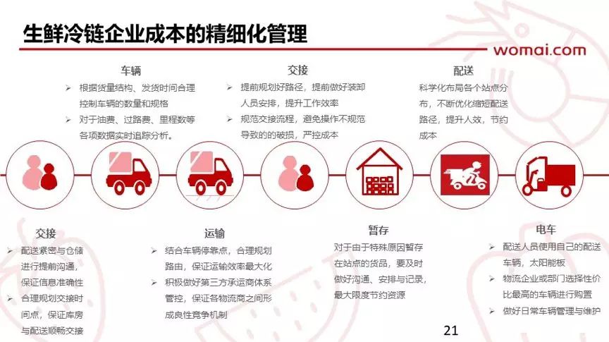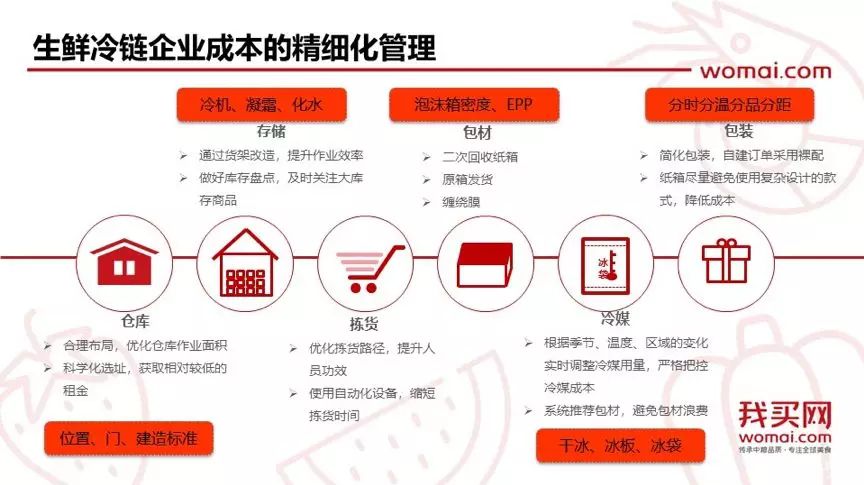 第二:运配,在运输和配送这一块,最希望的就是裸配,但是全中国只有中粮我买网自己在自建领域做到这一点,裸配能把仓储的干冰和泡沫箱全部省下来,但是对很多的客户来说确实不公平,比如说客户在办公室就很麻烦,作为冷冻产品一般客户留的地址都是家里,所以我非常希望裸配企业能够出现。日本做的是非常不错的,但是日本的裸配在中国依然称之为“伪冷链”,根本原因在于依然是干冰+泡沫箱,再加上PVC防冷。在这方面希望大家有机会可以到英国去一趟,某家企业可以做到每个箱子里面放很多的订单,每个箱子都是不同的温度控制,非常厉害。
