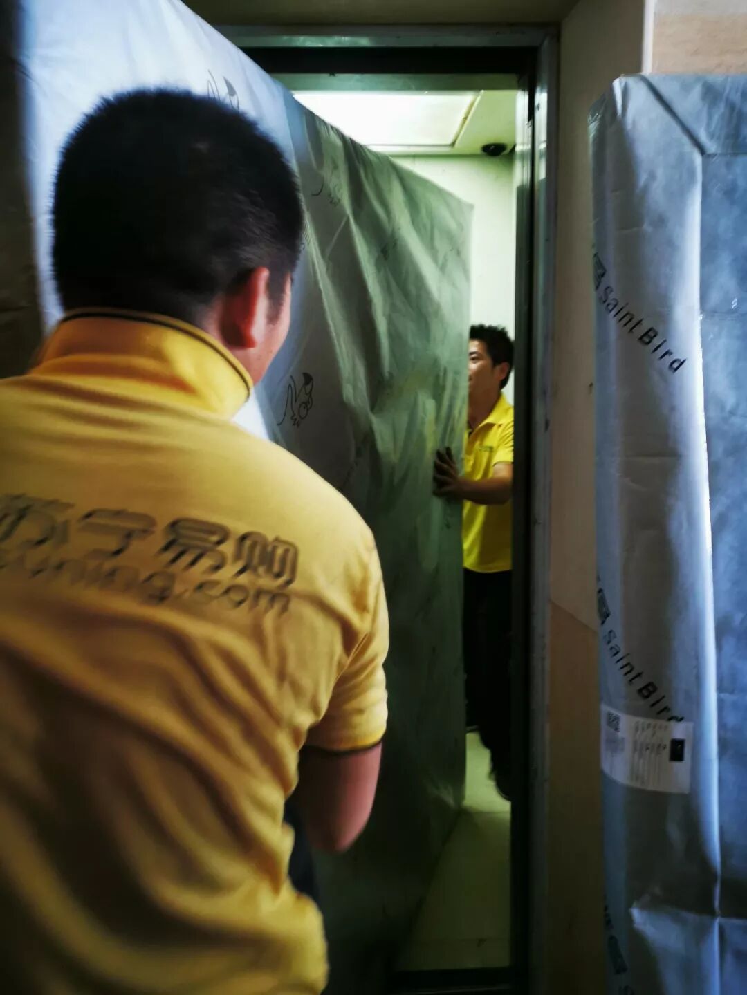 记者发现,工作人员除了满头大汗外,发现他们都乐滋滋的,了解得知,原来这一单在上楼过程中因为用户定制的家具材料尺寸刚好与所在小区楼道、电梯相匹配,这样就不用人工扛着大件上17楼了。