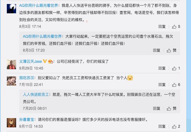 再翻看人人快送的官方微博,不少微博的下方留言都出现了维权的声音,主要是骑手讨薪。甚至有讨薪者自己开通微博进行维权。还有消息称,人人快递骑手以拖欠工资为由,在上海黄浦区劳动人事争议仲裁委员会申请仲裁。此外,在人人快递讨薪群,有员工称“欺骗我们次数太多,时间太长”。