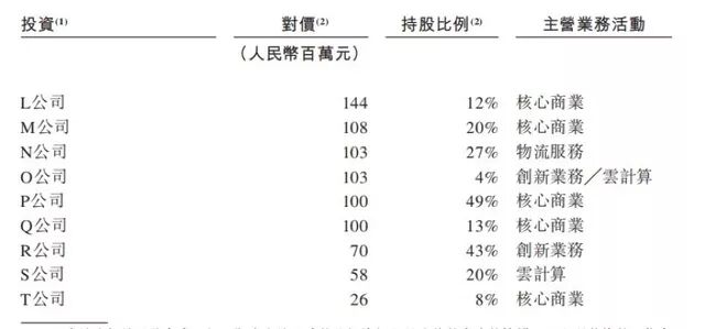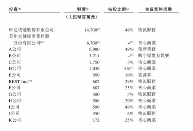 笔者留意到,其中投资金额最多的为申通快递的147亿元,持股比例为46%;其次是对美年大健康投资67亿元;对百世物流投资6.87亿元,持股29%。其余20家公司则以字母代替,并未公布公司名称。