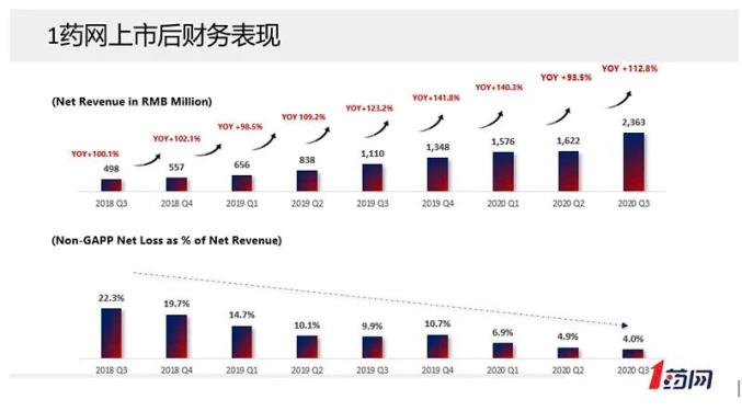 管理层里不得不提一下于刚博士,他既是学术大牛,是德州大学奥斯汀分校的终身教授,又学以致用,最终成了一个连环创业者。他也曾为亚马逊掌管庞大的全球的供应链体系。1药网于2018年在纳斯达克上市,当年全年销售17.8亿人民币;而刚刚披露的2020年Q3销售数字,一个季度就是23.6亿。2020预计销售完成81.2个亿,而去年是39.5个亿,这是一个以YOY