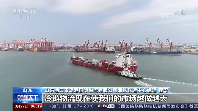 山东港口青岛港国际物流有限公司海铁联运中心经理 程琦:通过我们港口进来的商品,像东南亚的水果,智利的牛肉和红酒等冷链食品,再通过铁路或者公路的冷链运输到全国各地。冷链物流现在使我们的市场越做越大,世界越来越小。