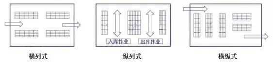 平面布置是指对货跺、通道、货跺间距、收/发货区等进行合理规划。主要布置形式有横列式、纵列式、横纵式、倾斜式、围绕式等。