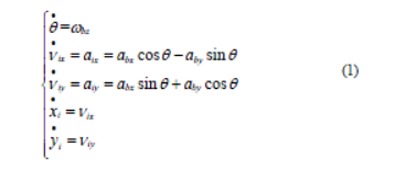 AGV 惯性导航系统的惯性坐标系为xi、yi、zi,运载体的坐标系为xb、yb、zb,如图1 所示,运载体的坐标系与惯性导航系统的惯性坐标系沿z 轴的转角为θ,惯性导航系统包括两个加速度计和一个陀螺仪,分别测量x 轴、y 轴的加速度和z 轴方向的角速度。