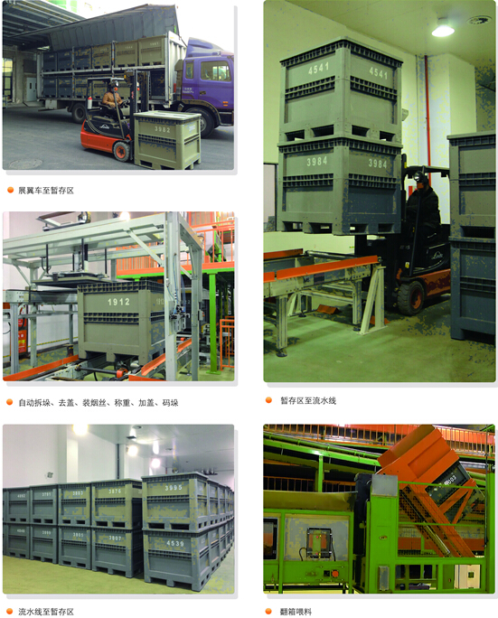 冠宇首创的塑料智能烟丝周转箱,适应烟草企业制丝卷包分离的工艺需求,配合自动装烟、翻箱喂料生产系统设备,实现了烟丝生产/储运标准化、自动化,为制丝卷包分离提供以塑代木、以塑代纸的绿色环保解决方案。