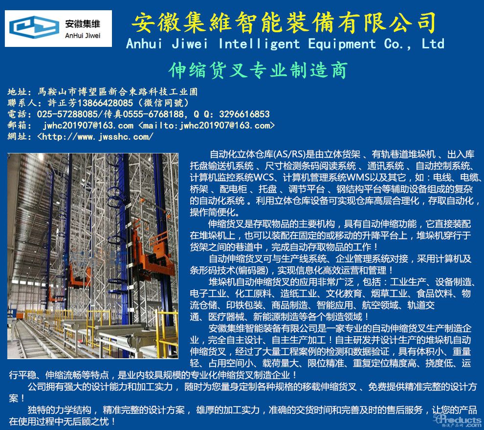 安徽集维智能装备有限公司是一家专业的堆垛机双向自动伸缩料叉制造商,拥有多位专业的工程设计师,全套的机加工设备,完全自主设计、自主生产,具备年生产1200台套的制造能力,完成了多个比较经典的工程案例,并与国内多家知名集成商达成长期合作协议!自主研发并设计生产的堆垛机自动伸缩料叉,经过了大量工程案例的检测和数据验证,具有体积小、重量轻、占用空间小、载荷量大、限位准确、重复定位精度高、挠度低、运行平稳、伸缩流畅等特点!