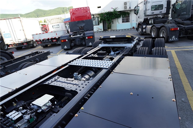 乘龙H5超轻版纯电牵引车的核心杀手锏是极致轻量化。通过新材料、新结构、新工艺等创新技术,科技降重不降质,将整车自重压缩至惊人的8.9吨,比同级别产品至少轻1.1吨。这意味着每趟运输都能多拉1.1吨货,一年累积增收显著,真正将“轻”转化为实实在在的利润。