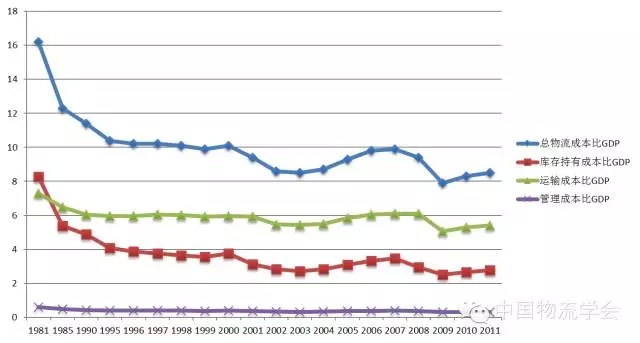 这些年,美国的物流总成本和其他三个要素整体呈现下降的趋势,主要是因为供应链系统的优化。在研究过程中,选择美国物流成本比GDP为被解释变量,人均GDP、服务业增加值占GDP比重、库存费率作为解释变量,对影响美国的物流成本因素做多元回归分析。此分析主要考虑了国家发展水平、产业结构、管理水平等因素对物流成本的影响。其中,选取人均GDP代表国家经济发展环境,服务业增加值占GDP代表产业结构,而库存费率则从某种程度反映了物流管理水平和管理效率。分析表明,服务业的增加值与物流成本占GDP的比例是负相关的。从标准系数的绝对值可以分析三个指标对因变量的相对影响程度,库存费率占比最高,即管理效率提升、管理水平提高是影响1995-2011期间美国物流成本比GDP变化的最主要因素。